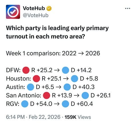 A week ago, the midterm season officially began with the commencement of early and mail voting in Texas. While primary election day is March 3rd, early voting in person will end this Friday (the 27th). So far, the turn-out should scare Republicans as much as they will excite Democrats. As of the close of business Monday, nearly 100,000 more Democrats have cast early and mail votes than Republicans according to VoteHub.